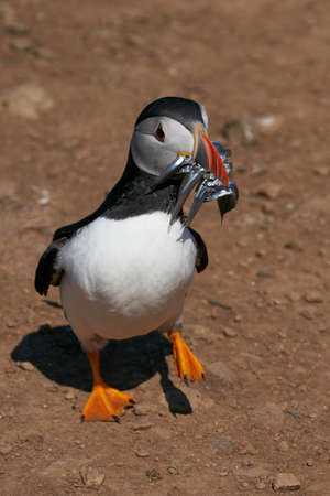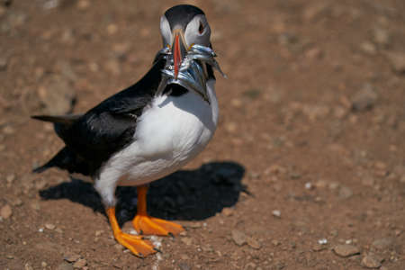 Atlantic puffin (Fratercula arctica) carrying small fish in its beak to feed its chick on Skomer Island off the coast of Pembrokeshire in Wales, United Kingdom