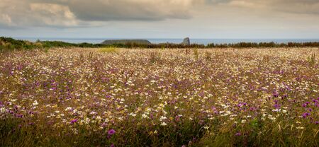 Wild flowers growing in the fields around the iconic landscape of Worms Head on the Gower peninsula in Swansea, South Wales, UK