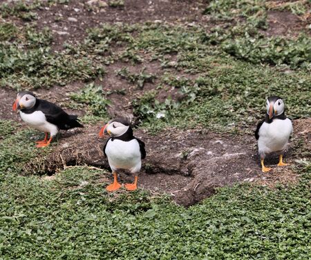 Atlantic Puffins (fratercula arctica) next to their burrows in mid summer