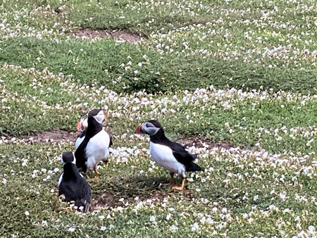 Four Puffins on Skomer Island in the Summer Sunshine