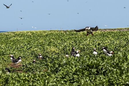 UK, Farne Islands, June 2019: Puffin coming into land amogst the burrows