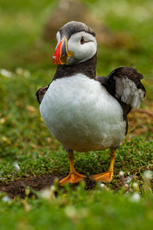Cute Atlantic Puffin spreading wings, Shetland Islands, UK