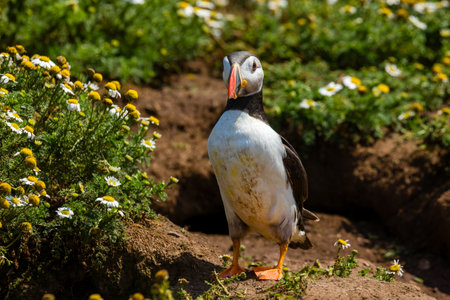 Portrait of Atlantic puffin in natural habitat, Fratercula arctica. One bird sitting on cliff with blooming chamomiles in Latrabjarg, Iceland.