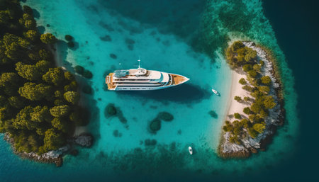 Top view on luxury yacht in paradise turquoise ocean water. Generative AI.