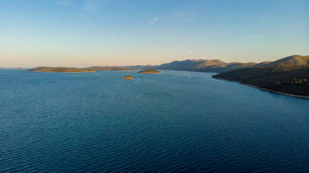 Drone aerial view of Telascica bay in National Park, Croatia. Croatian beautiful islands in Adriatic Sea under bright blue sky