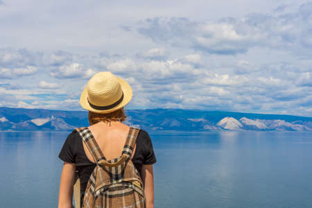 Attractive tween tourist girl in hat and backpack standing on cliff top and admiring beautiful landscape of blue sky and Baikal lake. Hiking, travelling and summer vacation concept.