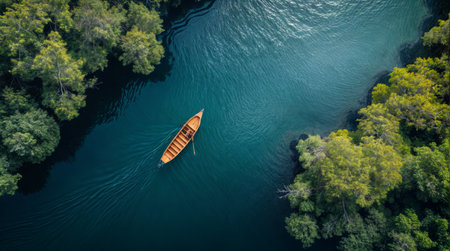 A wooden rowboat glides across a calm, tree-lined lake, captured from above with rippling water creating a peaceful scene.