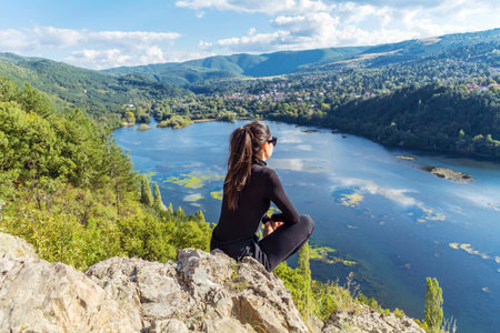 Woman sitting on the edge of a cliff overlooking the lake and mountains