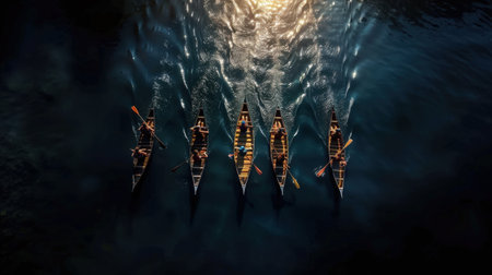 Rowers in sleek canoes glide through shimmering water, creating mesmerizing pattern. sunlight reflects off surface, enhancing serene atmosphere of teamwork and dedication