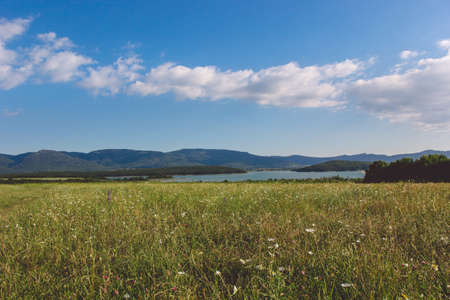 Green field and mountains. Lake near the village in Crimea. Spring landscape in the mountains at the bottom of the green and a beautiful lake.