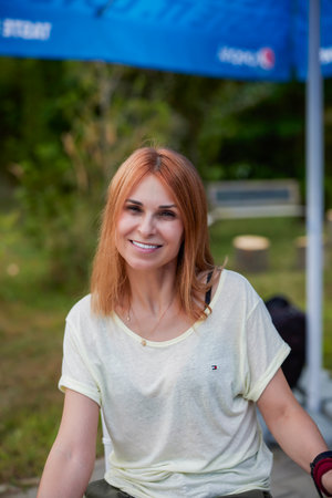 September 15, 2019 Minsk Belarus Half Marathon Minsk 2019 In black and white, happy photographer with a camera crosses the finish line with athletes