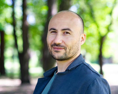 face of a bearded smiling bald man in the park. Portrait of a middle-aged man.