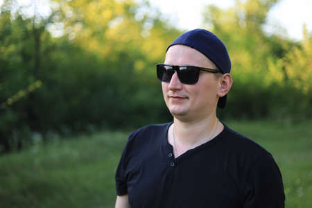 A young white guy or man in casual wear is enjoying the beauty of nature while being out of town, life style.