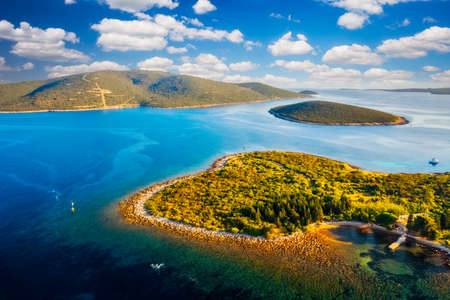 Exotic view of of Ilovik island on sunny day. Location Losinj island, Kvarner Gulf, Croatia, Europe. Aerial photography, drone shot. Luxury vacation concept. Discover the beauty of earth.