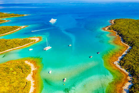 Great aerial view of the azure lagoon on sunny day. Location Kvarner Gulf, Punta Kriza, Cres island, Croatia, Europe. Drone photography of popular tourist destination. Discover the beauty of earth.