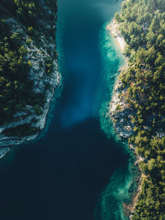 This photo captures an aerial perspective of a body of water encircled by rocky formations, Spectacular overhead view of a turquoise sea meeting rocky cliffs, AI Generated