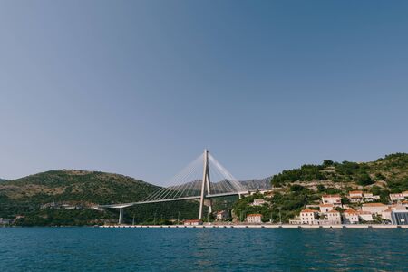 Franjo Tudjman is a cable bridge carrying the state road D8 on the western approach to Dubrovnik, Croatia via Rijeka Dubrovacka near the port of Gruzh. View from the sea, from a yacht.