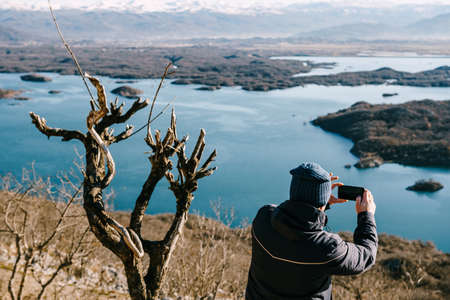 A man photographs Slansko Lake in Niksic, Montenegro with his mobile phone, against the backdrop of snow-capped mountains.