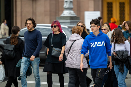 Kyiv, Ukraine - OCT 01, 2022: People, residents and guests, at warm autumn weekend on the streets of the capital stroll in the historical center and go shopping. A everyday street life in a big city.