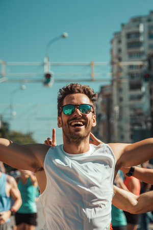 Caucasian male runner Running to the finish line in the city, people greeting at the finish line.