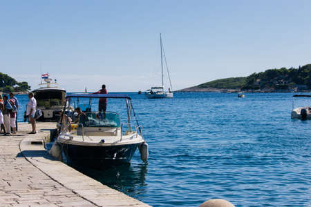 HVAR, CROATIA - May 20, 2016: A high angle shot of boats in a small port in Hvar city in Croatia