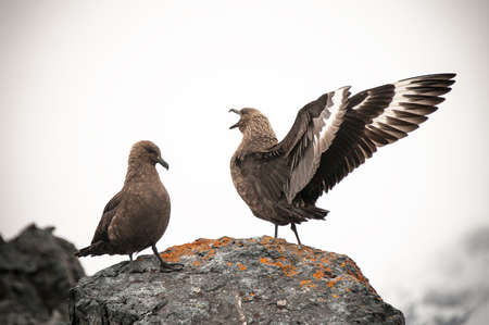 Great skua, Stercorarius skua, two birds on rock displaying, Handa, Scotland