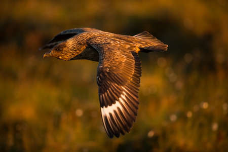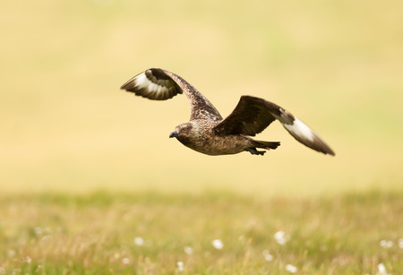 Close up of a Great Skua in flight in moorlands, Shetland Islands, UK.