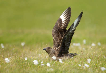 Two birds in white cotton grass habitat with lift up open wings. Brown skua, Catharacta antarctica, water bird sitting in the summer grass, Norway. Pair of Skua in the nature habitat. Wildlife scene.