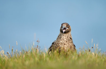 Close-up of a Great skua with wings spread calling on coastal grassland, UK.
