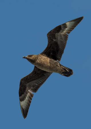 Great Skua in flight. Bottom view on white background. Scientific name: Catharacta skua.