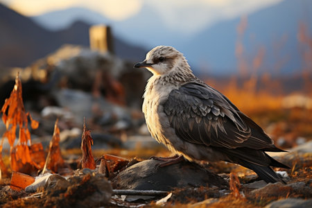 Big bird standing on a hill above icebergs in Jokulsarlon glacier lagoon. Global warming and climate change concept with melting ice. Base of the Vatnajokull glacier at Jokulsarlon, Iceland.