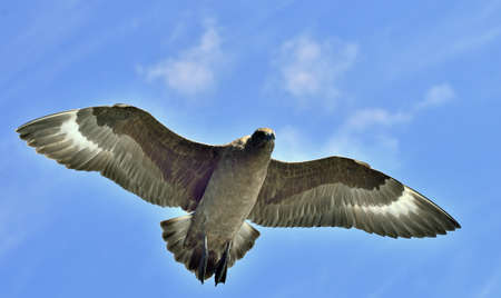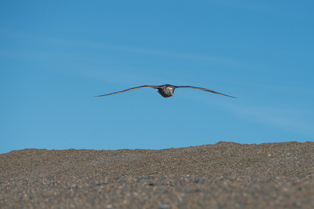 A petrel in flight against a background of blue sky and clouds. A bird with mottled brown plumage spread its wings. Side view Argentina.