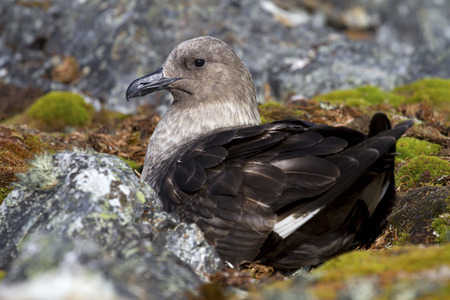 South Polar Skua female is sitting on eggs in a nest in the Antarctic summer