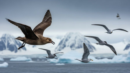 Seagulls flying over icebergs, Antarctic Peninsula, Antarctica