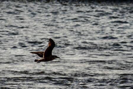 Flying Juvenile Kelp gull (Larus dominicanus), also known as the Dominican gull and Black Backed Kelp Gull. Blue ocean water background. False Bay, South Africa