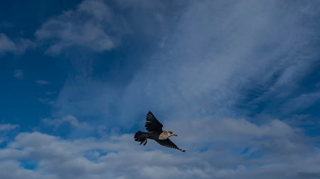 Seagull flying in the sky over the sea. Beautiful seascape.