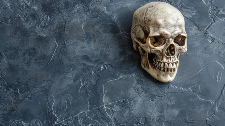 A skull rests on a smooth concrete surface. It is illuminated by natural light, casting a strong shadow that creates a contrast with the minimalistic background. The setting is simple yet striking.