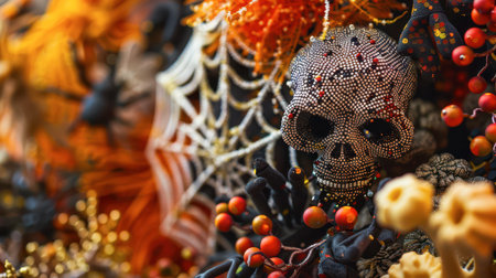 A glittering skull is surrounded by autumn leaves, spiders, and decorative elements, creating a festive atmosphere for Halloween.
