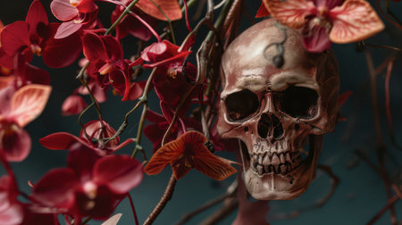 A detailed skull is nestled among bright red and orange orchid blooms, creating a striking contrast against a dark backdrop.