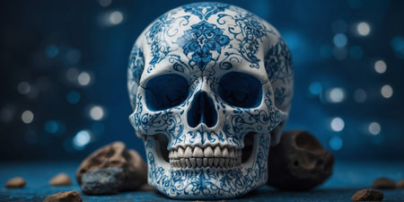 AI Generated. A white skull with red and blue designs sits on a blue background
