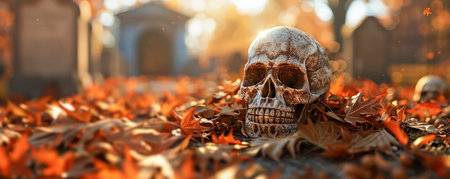 A chilling Halloween cemetery scene A weathered skull rests atop a moss-covered tombstone, surrounded by scattered autumn leaves Eerie shadows dance across the gnarled branches of ancient trees Perfect for adding a spooky touch to your Halloween decor AI Generative