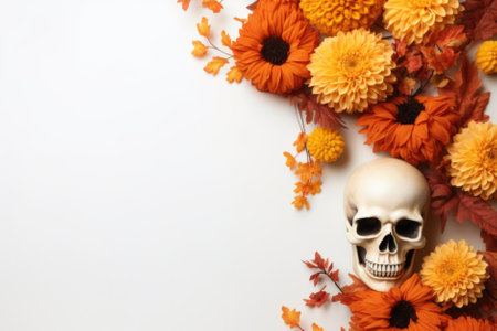 Happy Halloween holiday spooky scary background with decoration skull and flowers, Haloween event invitation poster card backdrop, trick or treat santa muerte fall party. Flat lay.