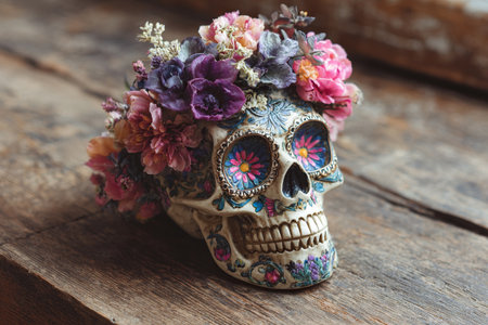 AI Generated. Weathered skull with vibrant floral wreath on a dark moody background