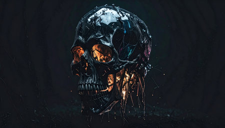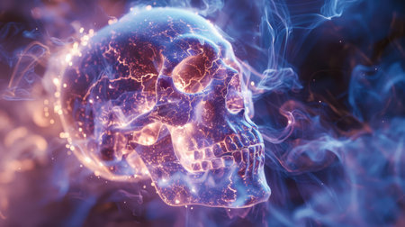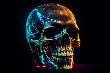 An AI generated illustration of a human skull illuminated in a dark
