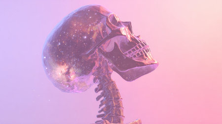 A cosmic-inspired skull displays intricate galaxy patterns, illuminated by soft pink and purple lights, capturing the beauty of the universe in artistic form.