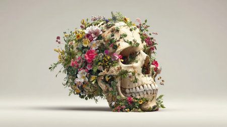 A skull adorned with vibrant sunflowers resting on its head, creating a striking contrast between life and death.