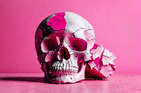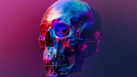 A vibrant and vividly colored skull is placed on the floor, showcasing an intriguing and eye-catching aesthetic, A neon-themed 3D model of a human skull with a fracture, AI Generated