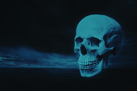 Closeup shot of a skull painted in blue hues evoking a macabre and mysterious atmosphere