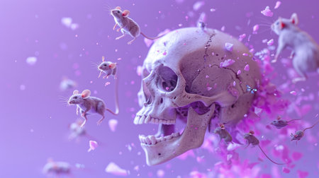 Surreal Skull with Floating Mice on Purple Background