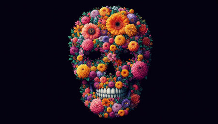 An artistic illustration of a tattooed human skull with intricate floral details, symbolizing the vibrant tradition of the Day of the Dead. copyspace. illustration created by Generative AI